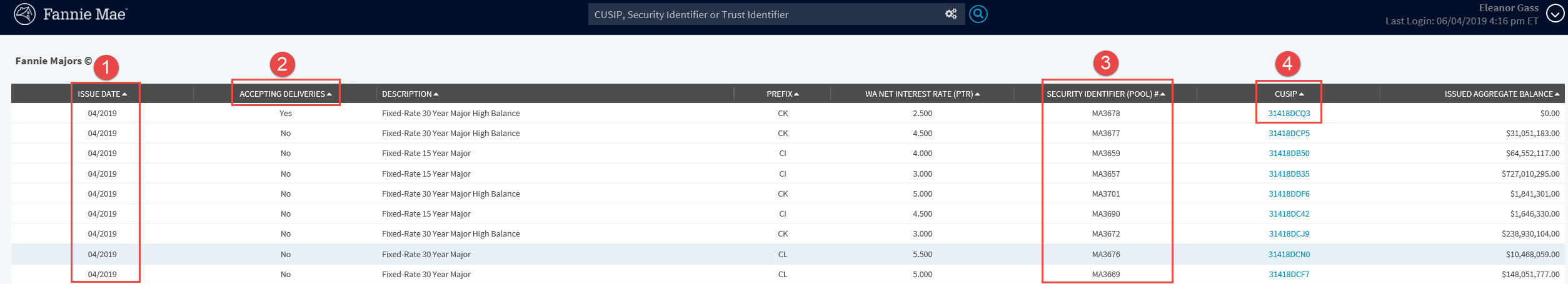 - Use the "SECURITY IDENTIFIER (POOL) #" and "CUSIP" columns to locate the Majors pools. If you do not know the pool number, you can also select one by looking at the “PREFIX” and “WA NET INTEREST RATE PTR” columns to locate a Majors pool that meets your needs.